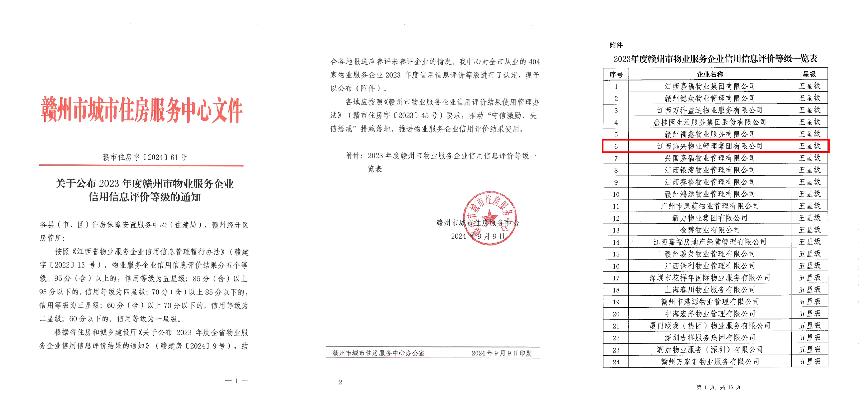 2024年9月9日,贛州市城市住房服務(wù)中心辦公室下發(fā)了《關(guān)于公布2023年度贛州市物業(yè)服務(wù)企業(yè)信用信息評(píng)價(jià)等級(jí)的通知》,市城市住房服務(wù)中心對(duì)全市從業(yè)的404家物業(yè)服務(wù)企業(yè)2023年度信用信息評(píng)價(jià)等級(jí)進(jìn)行了認(rèn)定,江西燕興物業(yè)管理集團(tuán)有限公司被認(rèn)定為五星級(jí)!