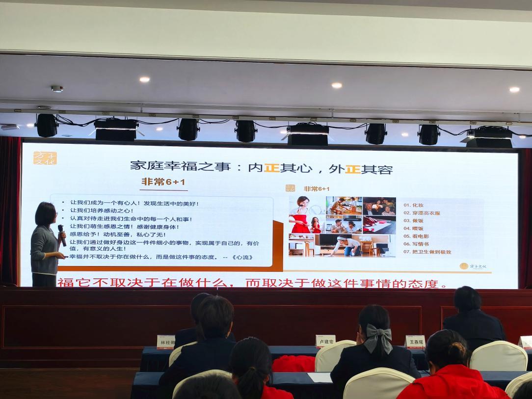 本次讀書分享會(huì)邀請(qǐng)了何啟菲老師為大家宣講。何啟菲老師是江西贛州人、國家公務(wù)員、高級(jí)經(jīng)濟(jì)師、家庭教育指導(dǎo)師,中華文化推廣志愿者、建設(shè)幸福家庭志愿者、方子文化區(qū)域大大方姐。分享會(huì)上,溫柔的何老師娓娓道來,結(jié)合自己家庭的故事,從打造“幸福方子”——事(非常6+1)、德(家家有本好念的經(jīng))、道(一個(gè)好女人,幸福三代人)、心(心好命就好,好人好自己)四個(gè)層面,圍繞《愛與陪伴》的實(shí)踐,就如何建設(shè)婆媳關(guān)系、夫妻關(guān)系、親子關(guān)系等家庭問題,分享了建設(shè)幸福家庭的方法與心法。